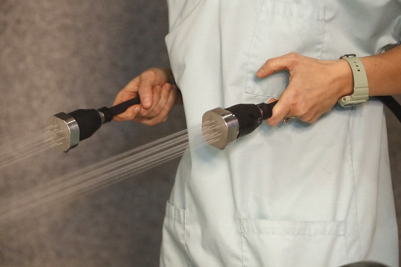 La douche filiforme est également un soin emblématique de la station. Dispensé par le médecin thermal, la douche filiforme permet de projeter l’eau à très forte pression sur la zone à traiter via des micro trous. Ce soin, pouvant aller jusqu’à 20 bars, est adapté par le médecin en fonction du patient. Ainsi, l’eau sous pression mobilise le tissu en profondeur, décolle le derme et lève les adhérences.